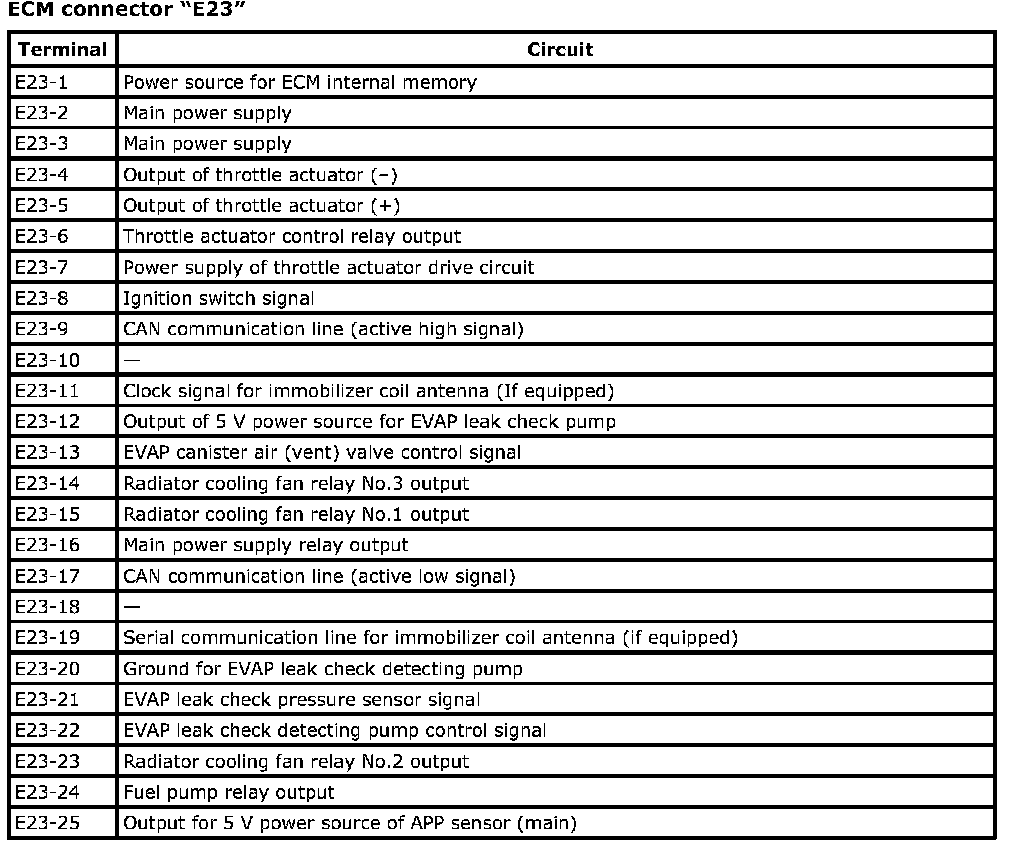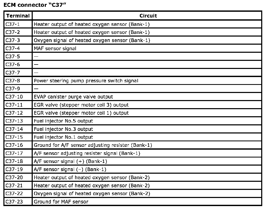 Terminal arrangement of ECM (PCM) connector (Viewed from harness side)