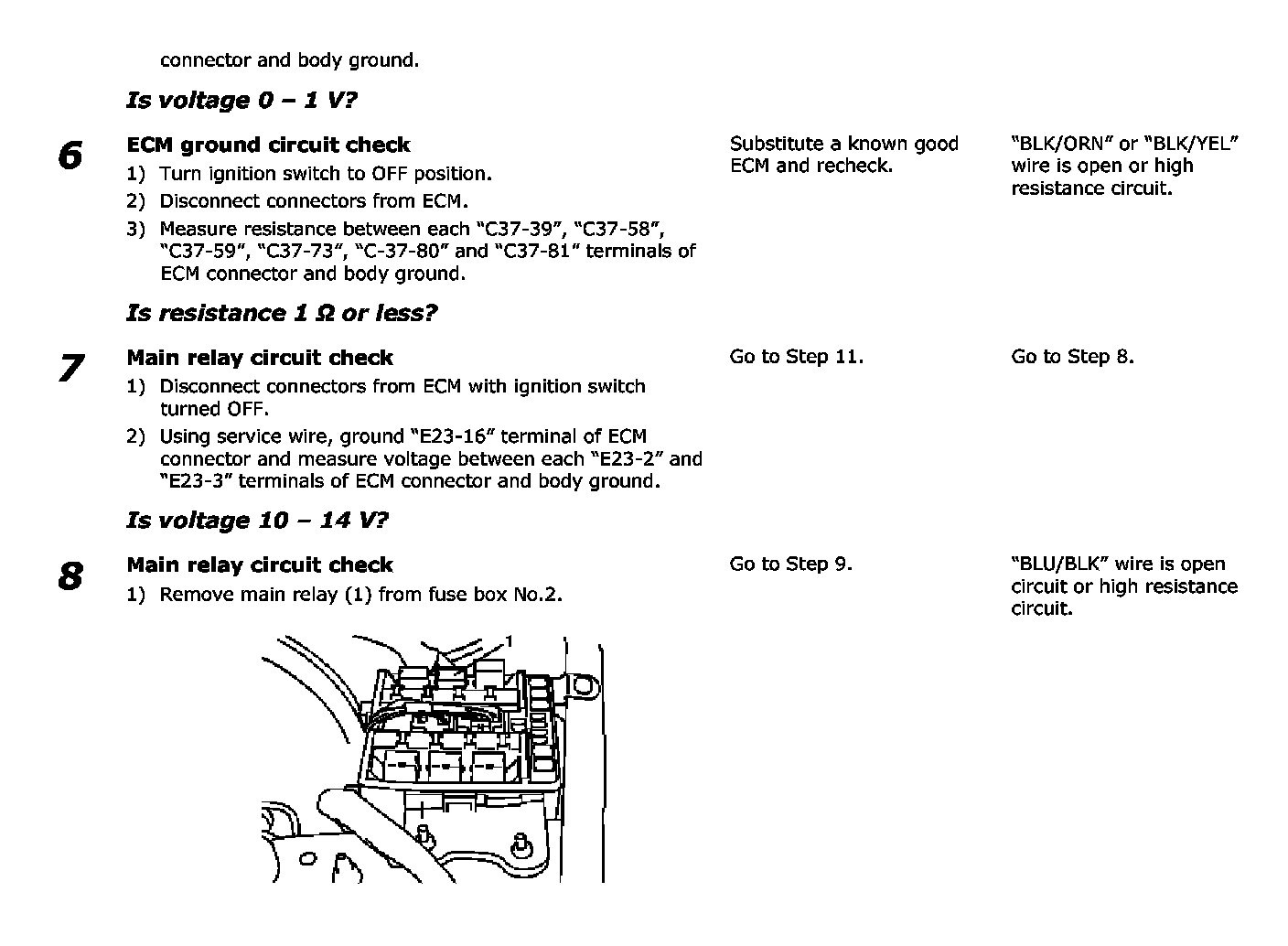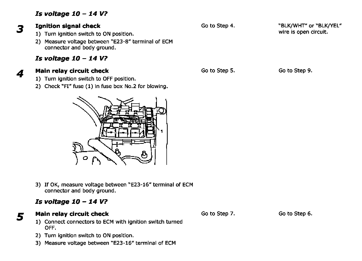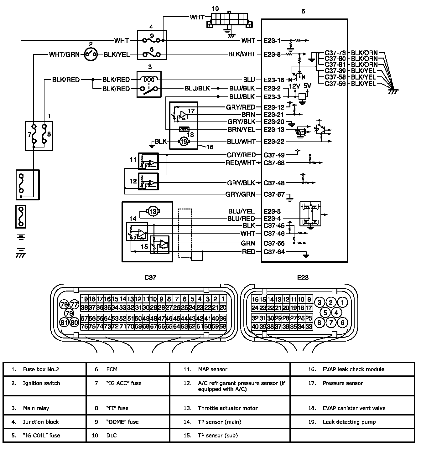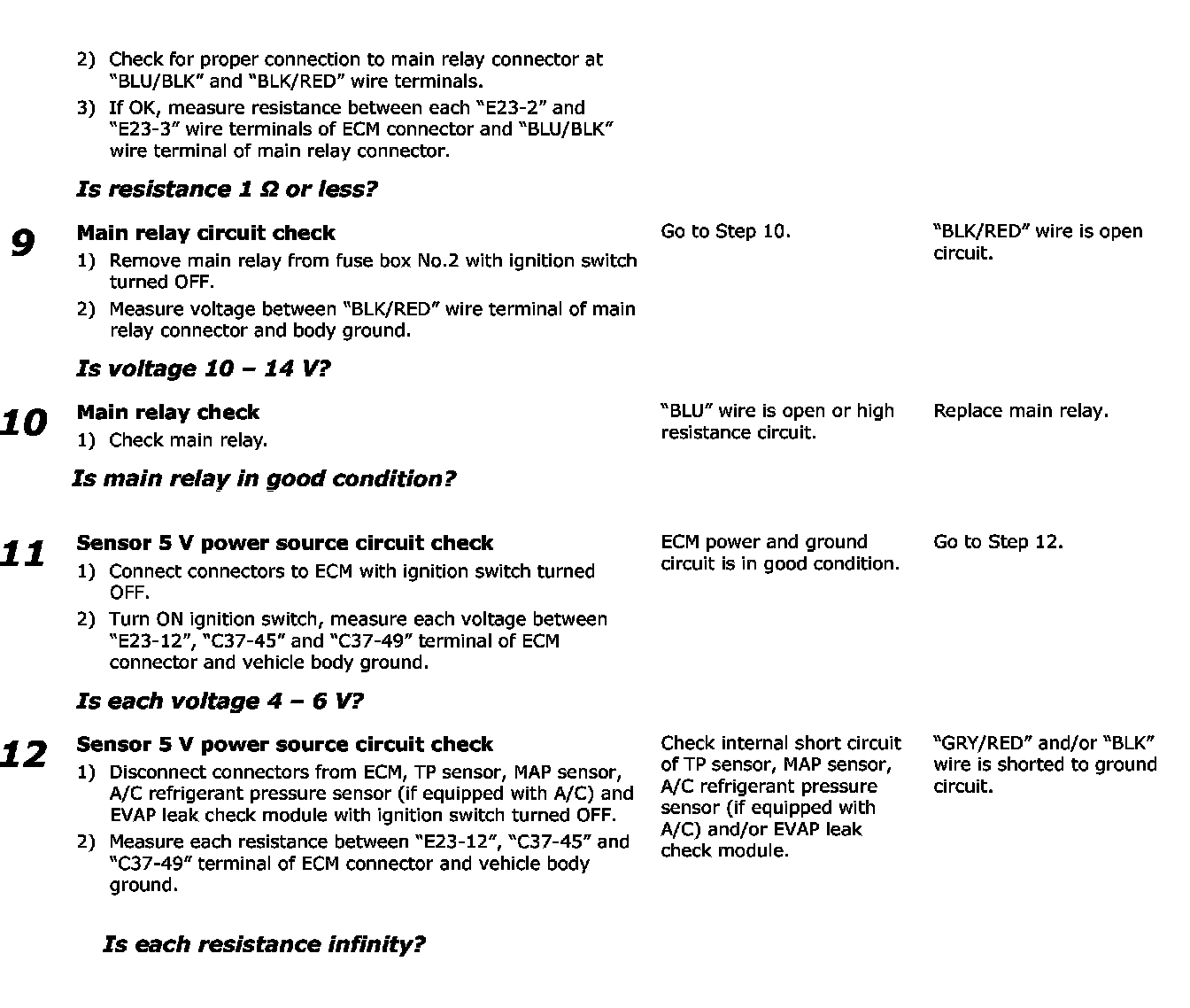 When the ignition switch is turned ON, the main relay turns ON (the contact point closes) and the main power is supplied to ECM. And then ECM supplies 5 V power to each sensor (MAP sensor, A/C refrigerant pressure sensor, TP sensor and pressure sensor (included in EVAP leak check module)).