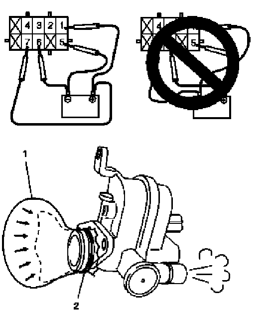 4. Connect 12 V-battery to terminal "6" and terminal "7" of EVAP leak check module. In this state, blow breath from port (3).
