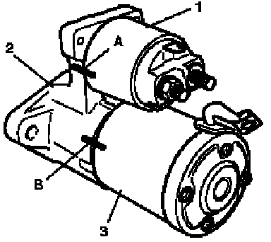 3. Put match marks at 2 locations (A (magnetic switch (1) and front housing (2)) and B (front housing (2) and yoke (3))) as shown in figure so that any possible mistake can be avoided.