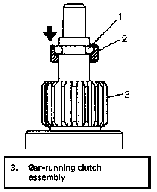 8. Install internal gear and over-running clutch assembly (1) to gear shaft (4), using care for installing direction of pinion stop ring (2).