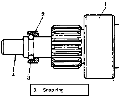 10. Remove snap ring (2), then pull out pinion stop ring (3) and over-running clutch (4) and internal gear (1).
