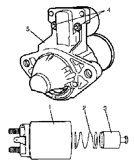 14. Install magnetic switch (1), spring (2) and plunger (3) to front housing (5) by aligning match marks provided before removal and then tighten screws (4).