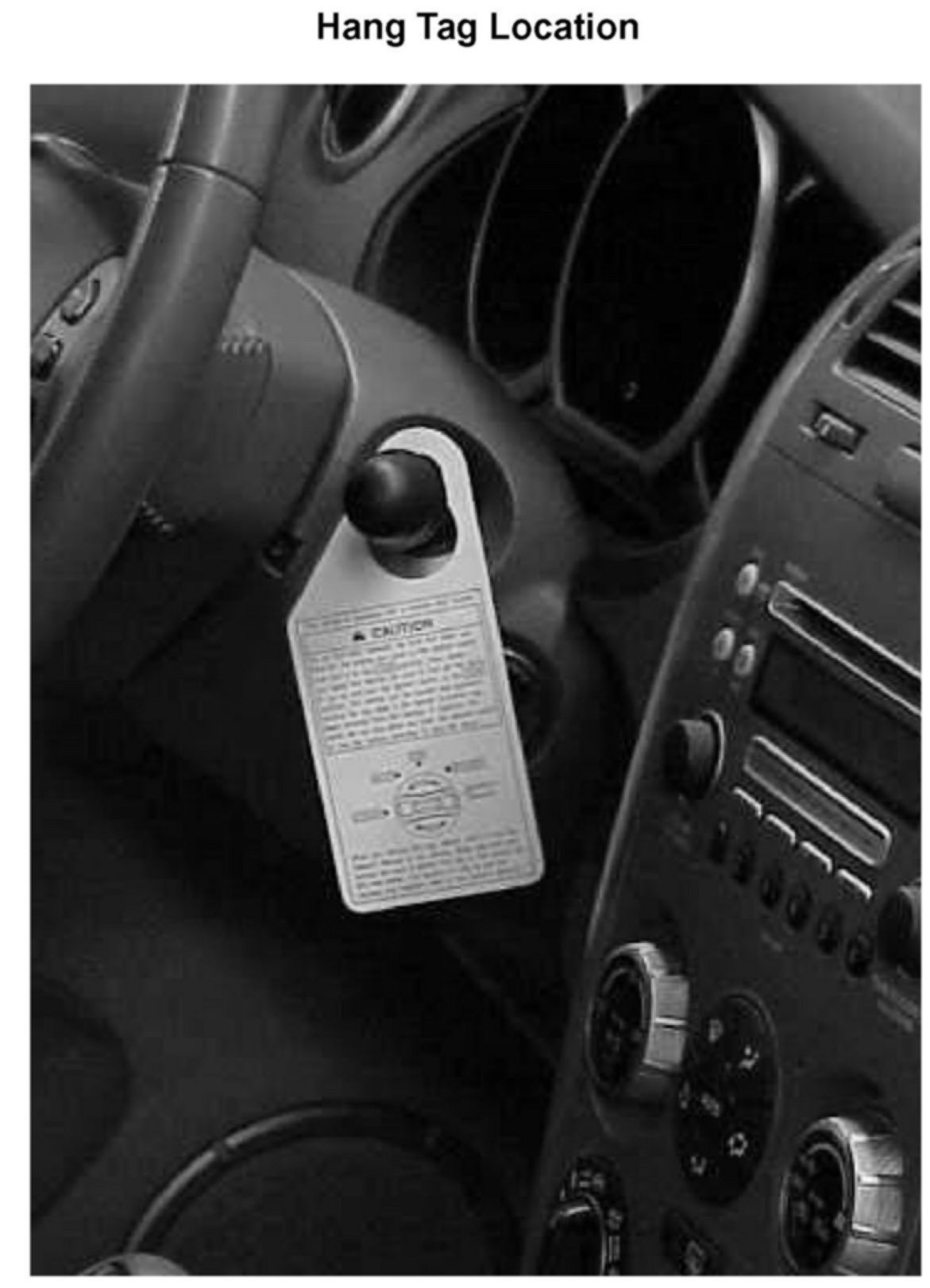 Install the hang tag onto the windshield wiper control stock (see illustration) and place the owner's manual supplement into the glove box of all affected vehicles in your dealership inventory. Refer to the VIN list for your dealers specific VIN's. A hang tag and owner's manual supplement has been included with this bulletin for each of these vehicles. See owner's manual supplement sample (Attachment A), keyless start hang tag sample (Attachment B) and VIN list of affected vehicles.