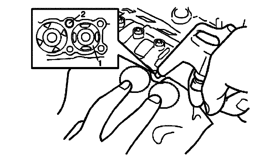 25. Remove 2nd (No.3) brake accumulator piston (1) by compressed air (392 kPa, 4.0 kg/cm2, 57 psi) into hole (2).