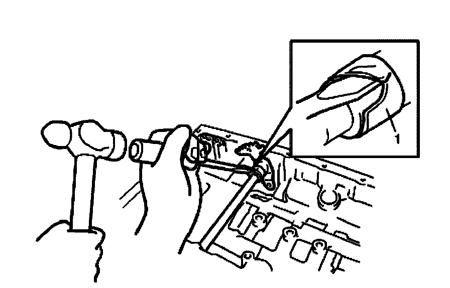 b. Drive out manual shift lever pin (1) by using special tool and hammer.