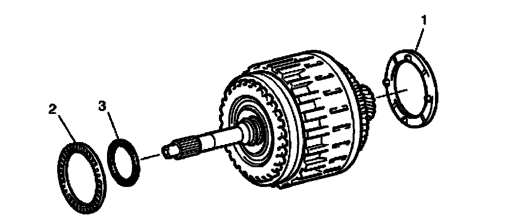 40. Remove clutch hub thrust washer (1) and thrust needle roller bearing No.1 (2) and thrust needle roller bearing (3) from clutch drum and input shaft assembly.