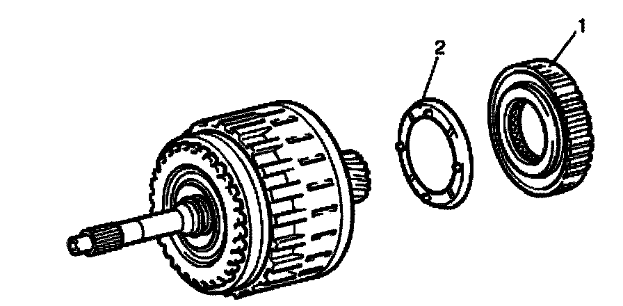 41. Remove one-way No.2 clutch assembly (1) and clutch drum thrust washer No.2 (2) from clutch drum & input shaft assembly.