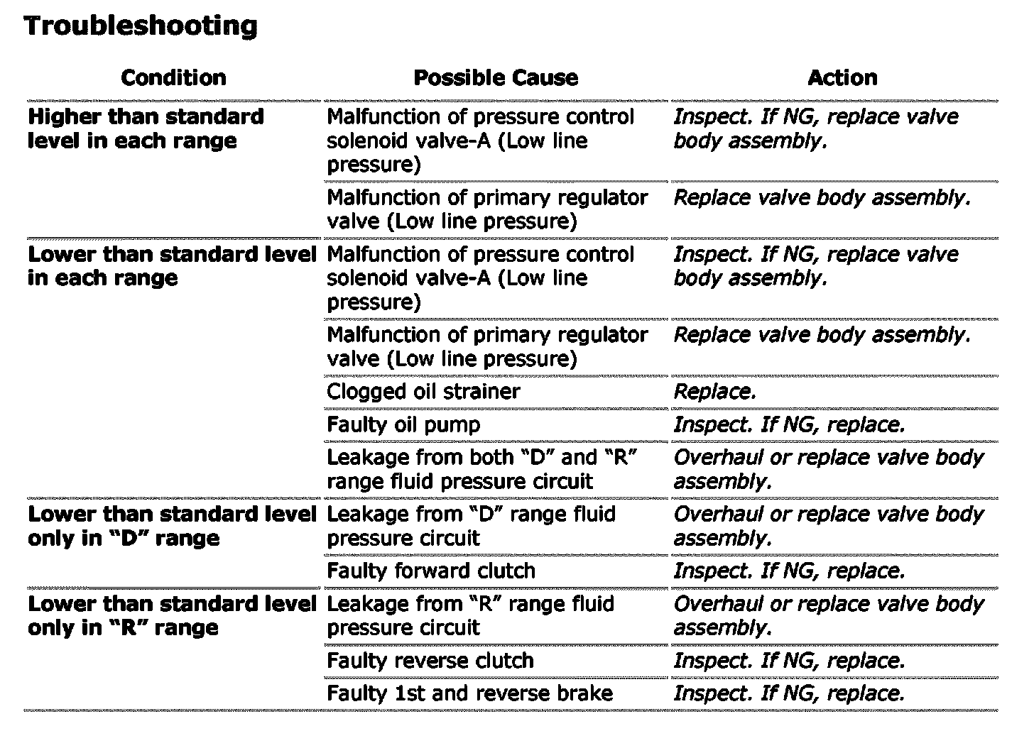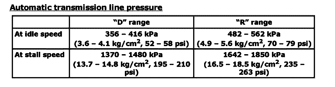4. Depress foot brake fully, run engine at idle and stall then check fluid pressure in D or R range.