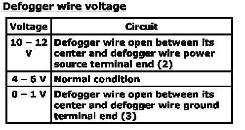 3. Measure voltage at the center of each defogger wire (1), and check defogger wire condition according to the following table. If defogger wire open is found, go to next step.