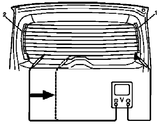 4. Touch voltmeter negative (-) lead to defogger wire ground terminal end (1).
