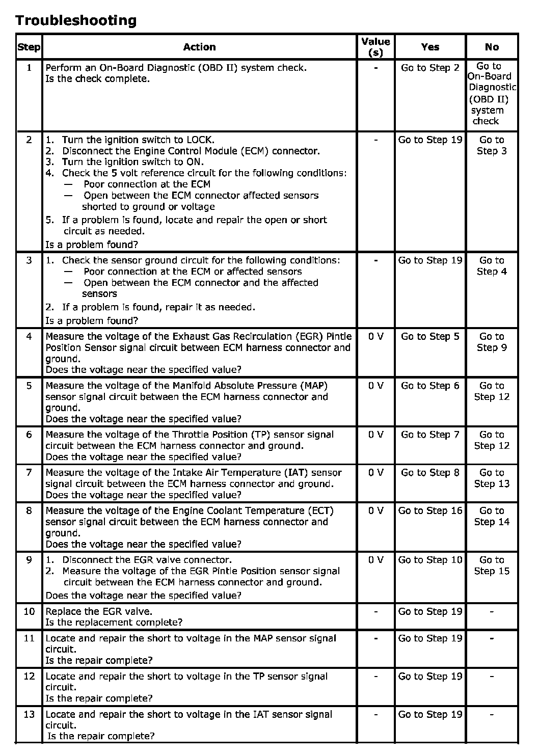 3. If a sensor input circuit has been shorted to voltage, ensure that the sensor has not been damaged. A damaged IAT or ECT sensor will continue to indicate a high voltage or low temperature after the affected circuit has been repaired. A damaged ACT, TP, MAP, Fuel Tank Pressure, or EGR Pintle Position sensor will indicate a high or low voltage or may be stuck at a fixed value after the affected circuit has been repaired. If the sensor has been damaged, replace it.