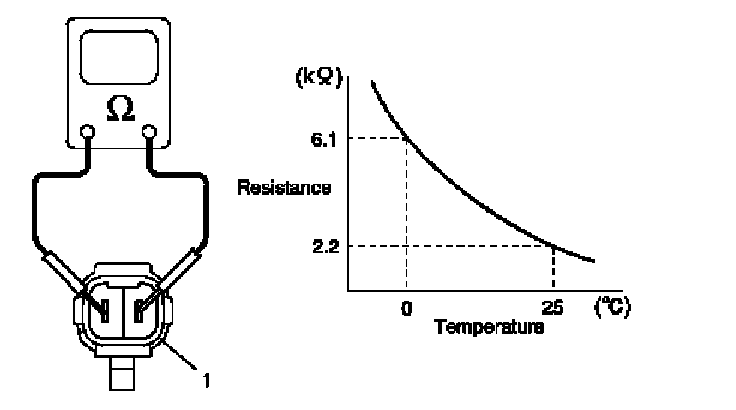 4. Immerse temperature sensing part of outside air temperature sensor (1) in ice water and measure resistance between sensor terminals while heating water gradually.