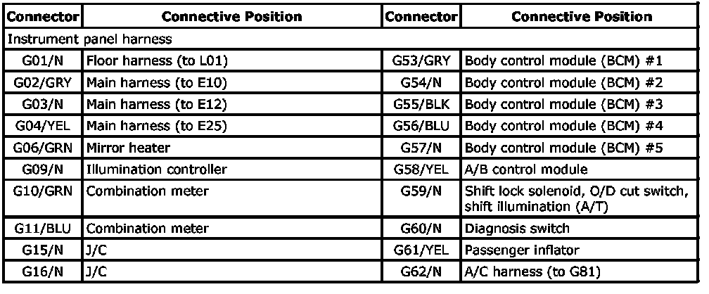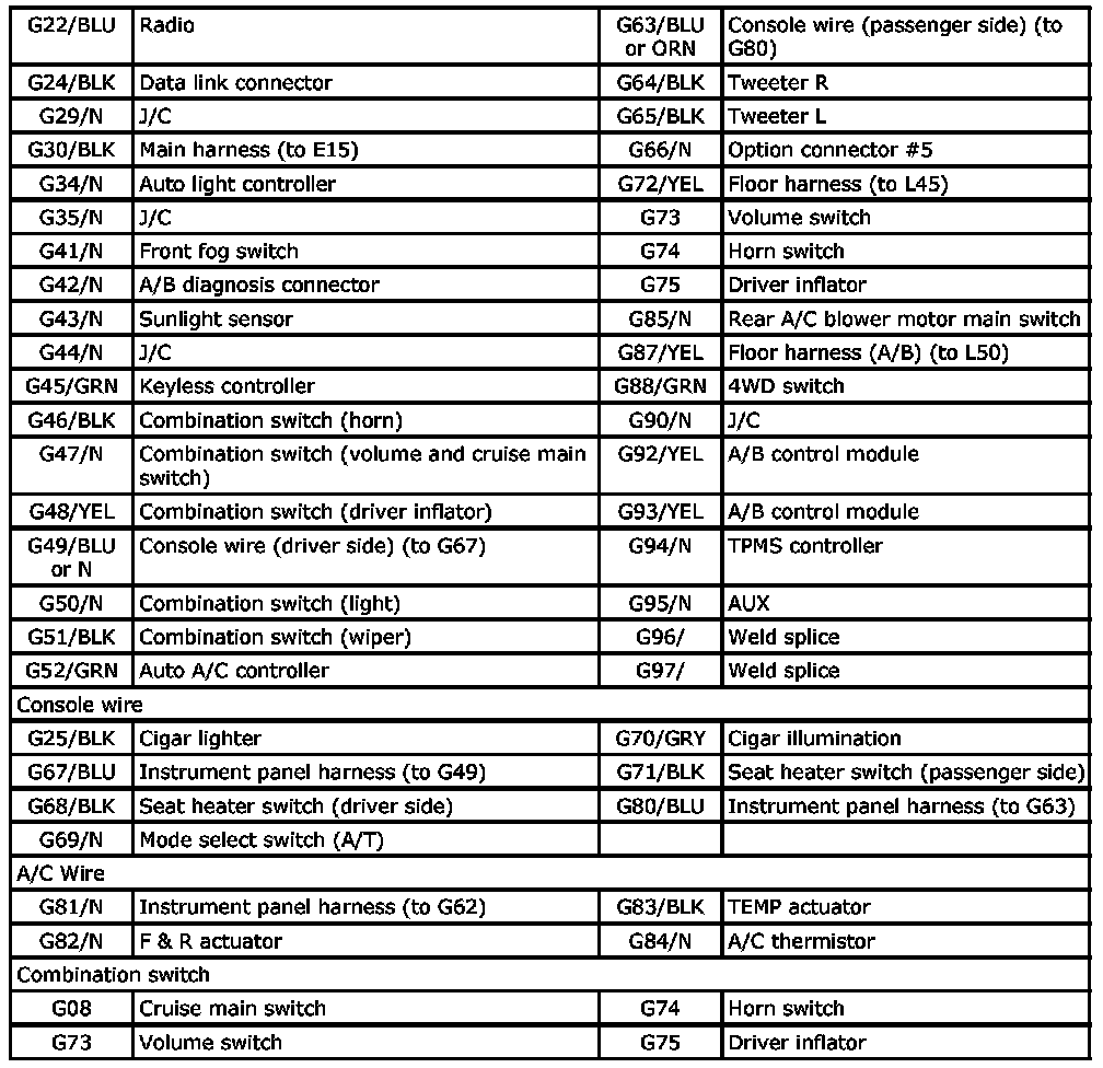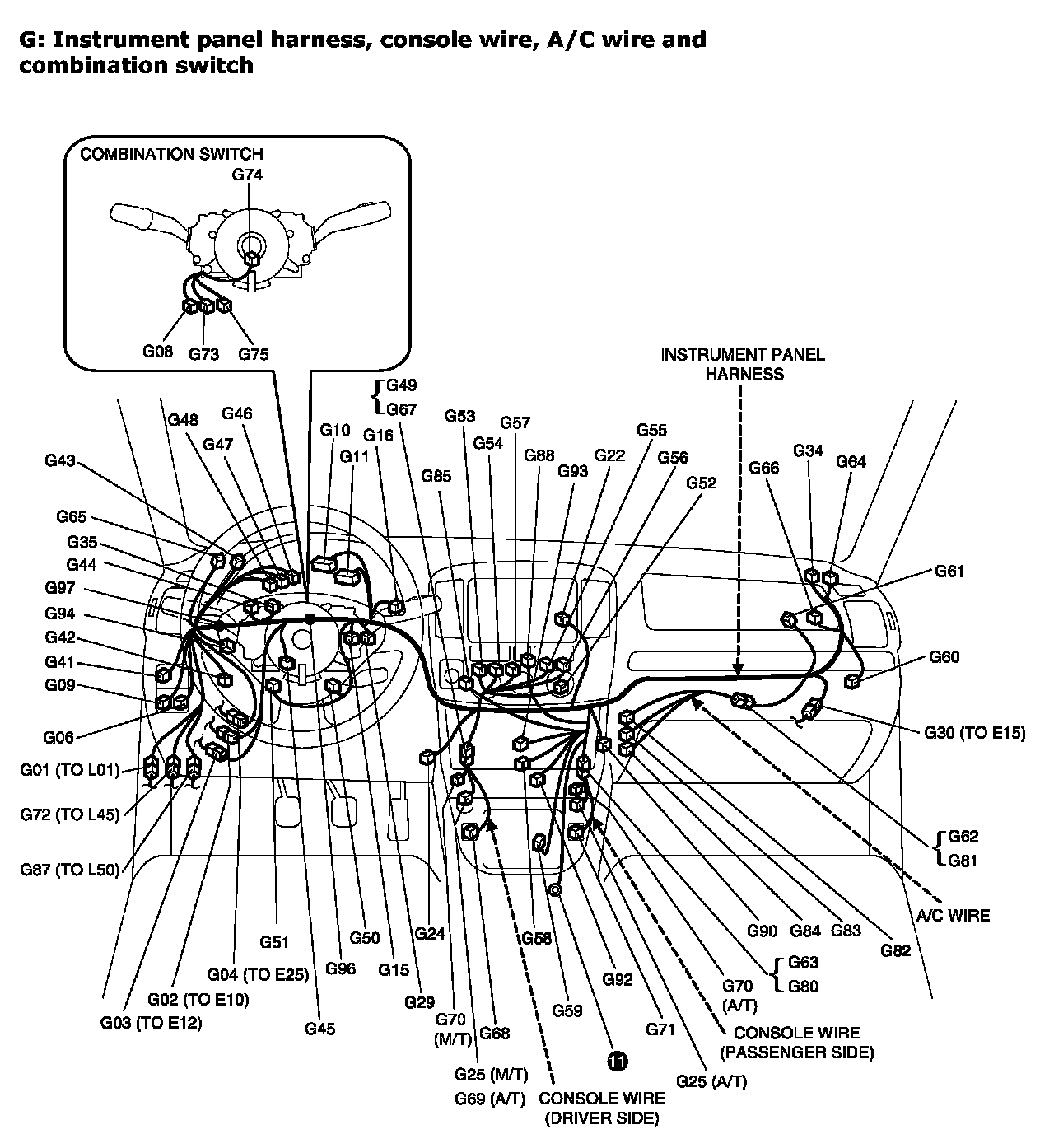 G: Instrument panel harness, console wire, A/C wire and combination switch Index: