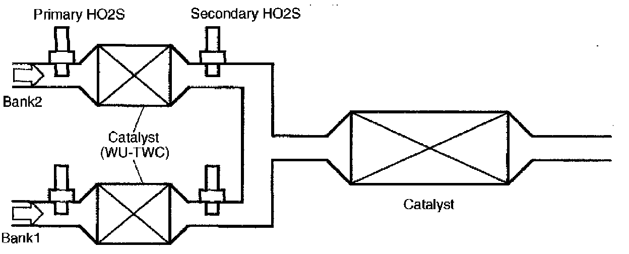 The system has 4 oxygen sensors located upstream and downstream of the catalysts. The layout of catalysts and oxygen sensors is described.
