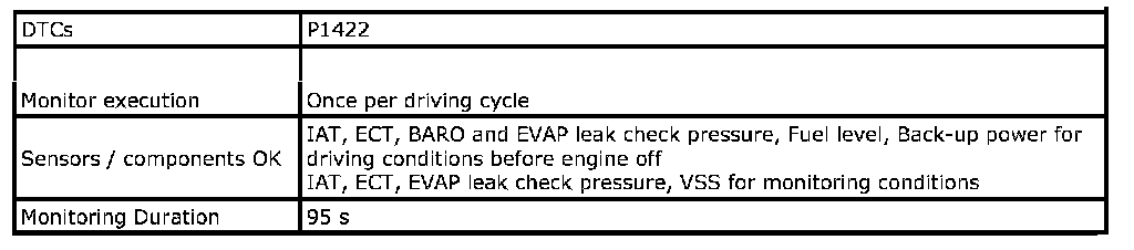 Refer to DTC P1422: Evaporative Emission System Leak Detect Pump Stuck OFF. P1422