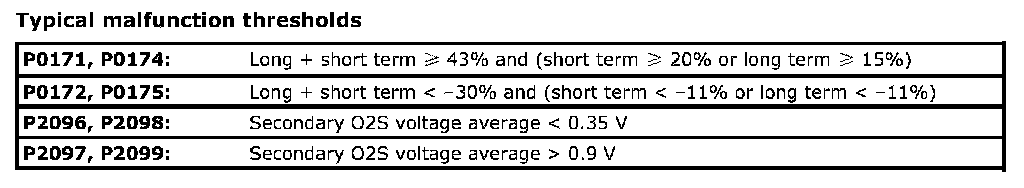 As fuel system components age or otherwise change over the life of the vehicle, the adaptive fuel strategy learns deviations from stoichiometry while running in closed loop fuel. These learned corrections are stored in keep alive memory as long term fuel trim corrections. They may be stored continue to change beyond normal limits or if a malfunction occurs, the long term fuel trim values will reach a calibratable rich or lean limit where the adaptive fuel strategy is no longer allowed to compensate for additional fuel system changes. Long term fuel trim corrections at their limits, in conjunction with a calibratable deviation in short term fuel trim, indicate a rich or lean fuel system malfunction.