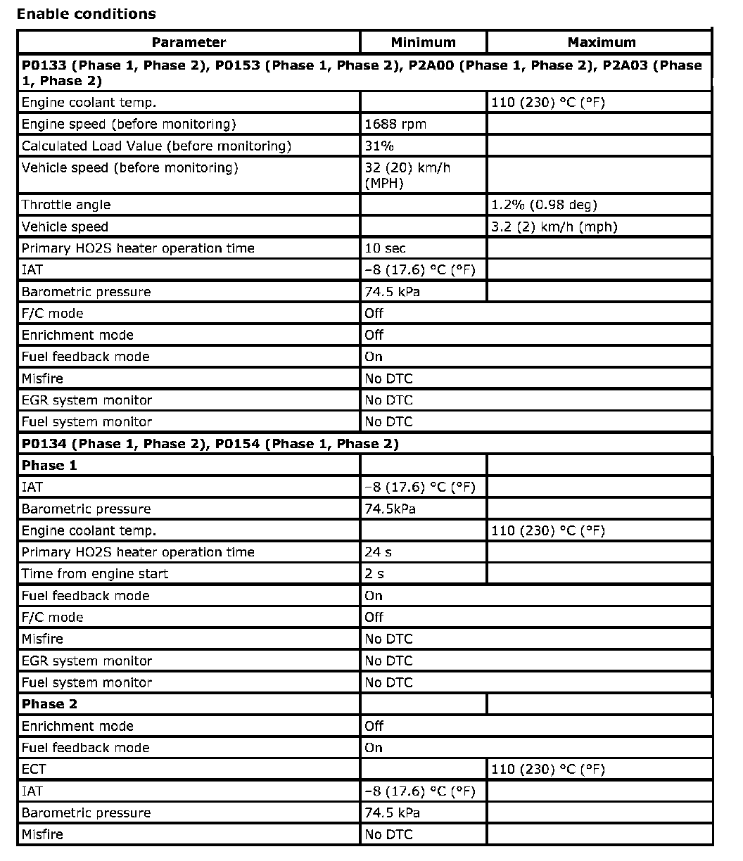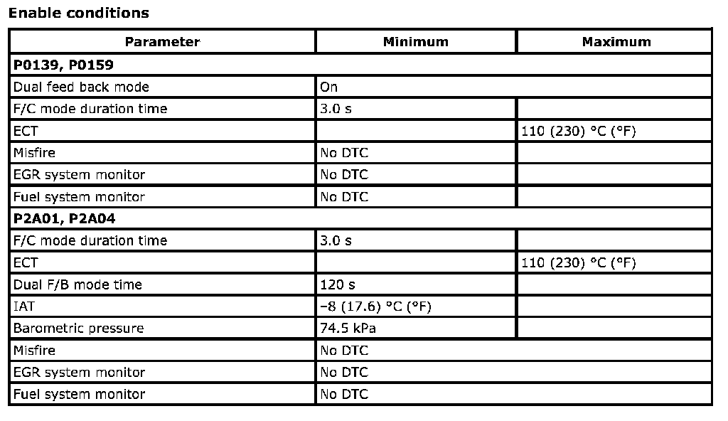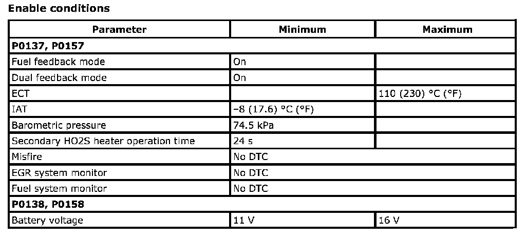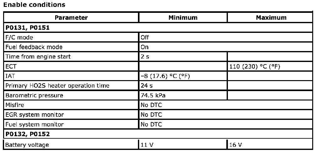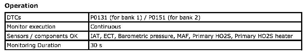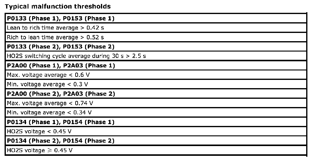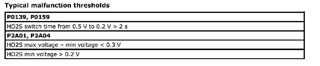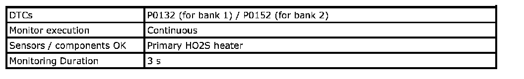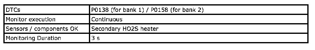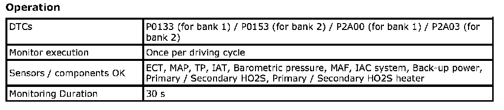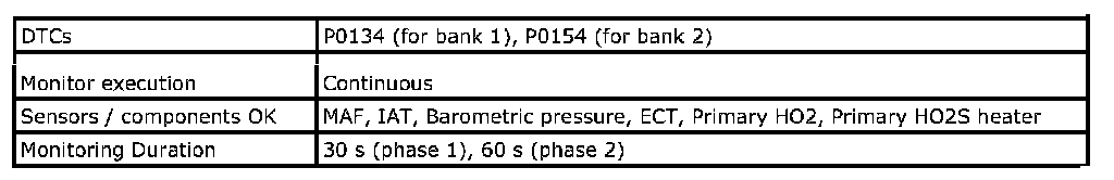 For a primary HO2S, the system monitors maximum and minimum voltage, lean-to-rich and Rich-to-lean response rates, and switching cycles during monitoring conditions once per driving cycle. The sensor is also monitored for activity continuously.