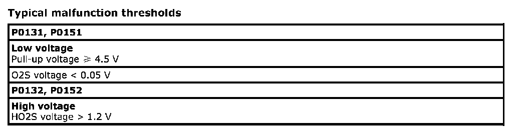 Refer to DTC P0131 / P0132: O2 Sensor (Bank 1 Sensor -1) Circuit Low Voltage / High Voltage. P0131 P0132