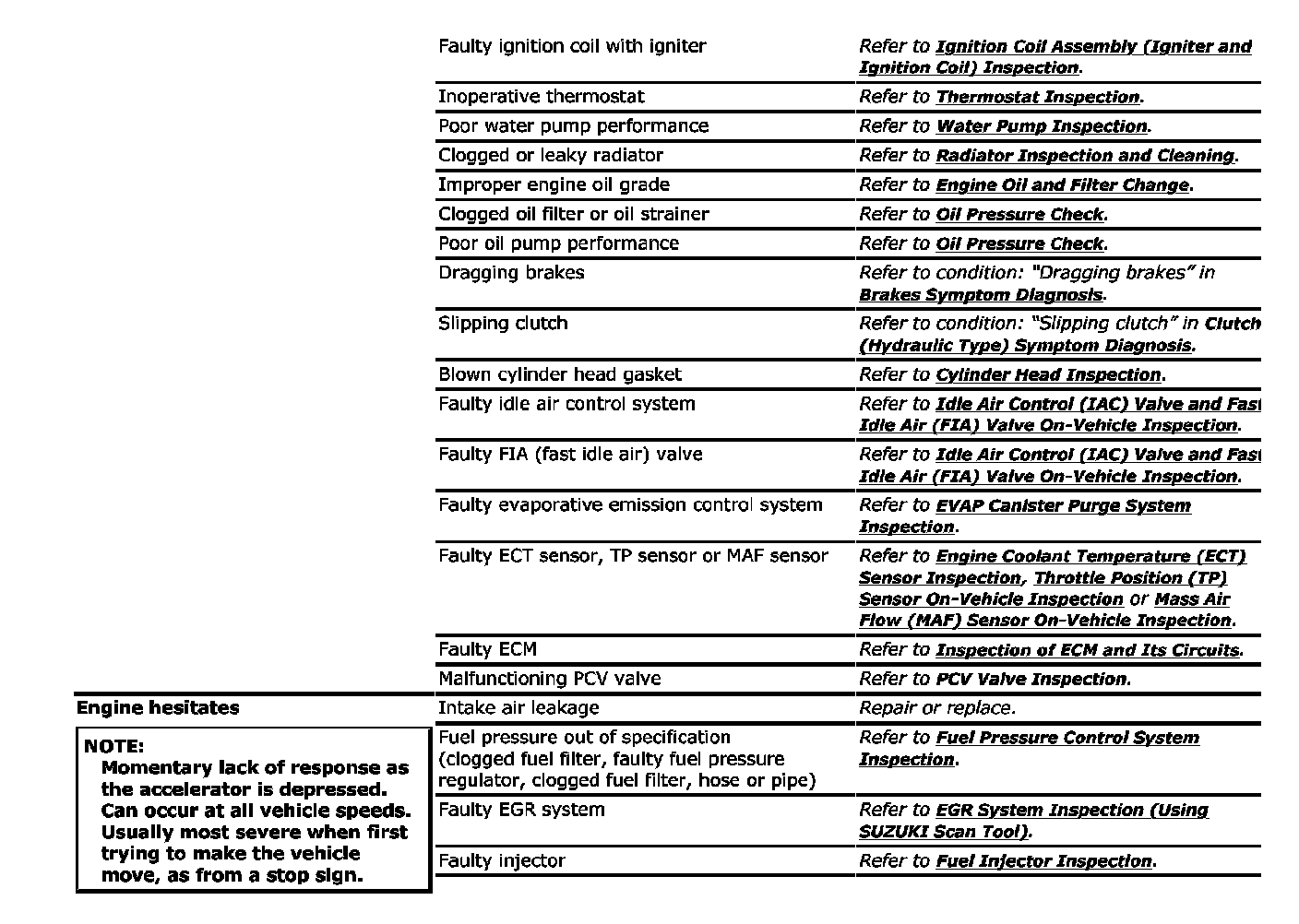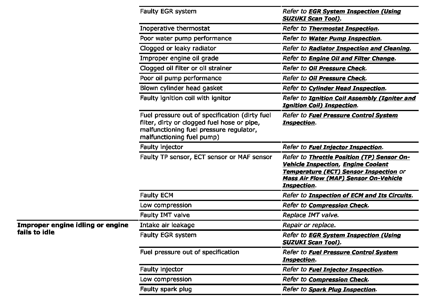 Perform troubleshooting referring to the above tables when ECM has detected no DTC and no abnormality has been found in Visual Inspection and Engine Basic Check.
