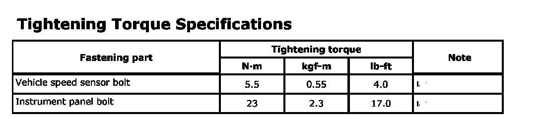Tightening Torque SpecificationsNOTE: The specified tightening torque is also described in the following. Instrument Panel Components