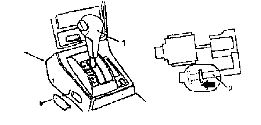 ^ With shift lock solenoid rod (or manual release plate) (2) moved in arrow direction and ignition key turned to "LOCK" position, select lever (1) can not be shifted from "P" range position to any other range.