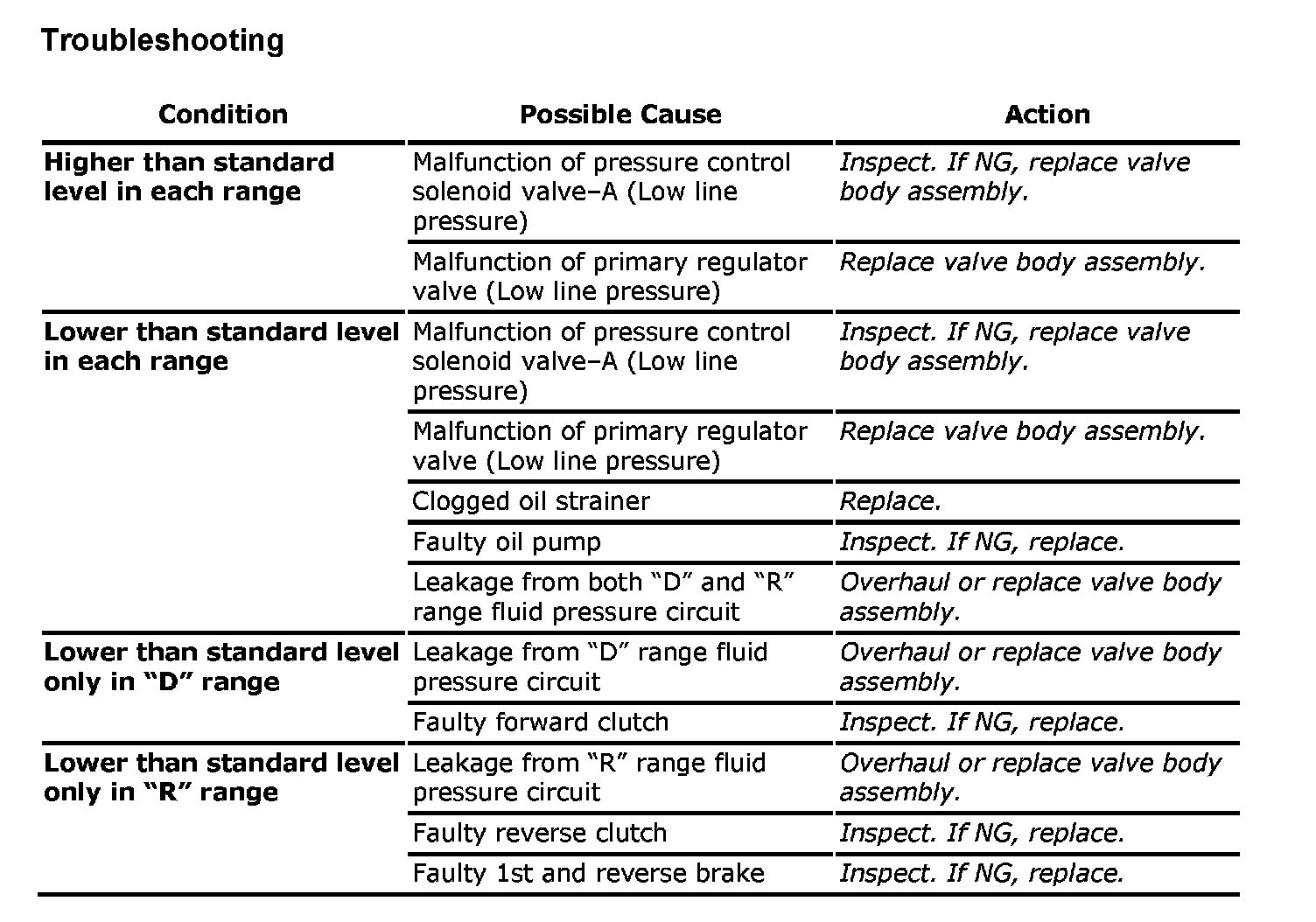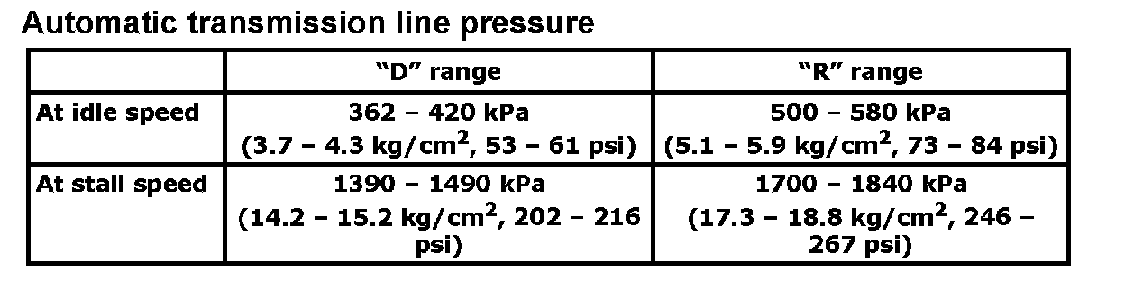 4. Depress foot brake fully, run engine at idle and stall then check fluid pressure in D or R range.