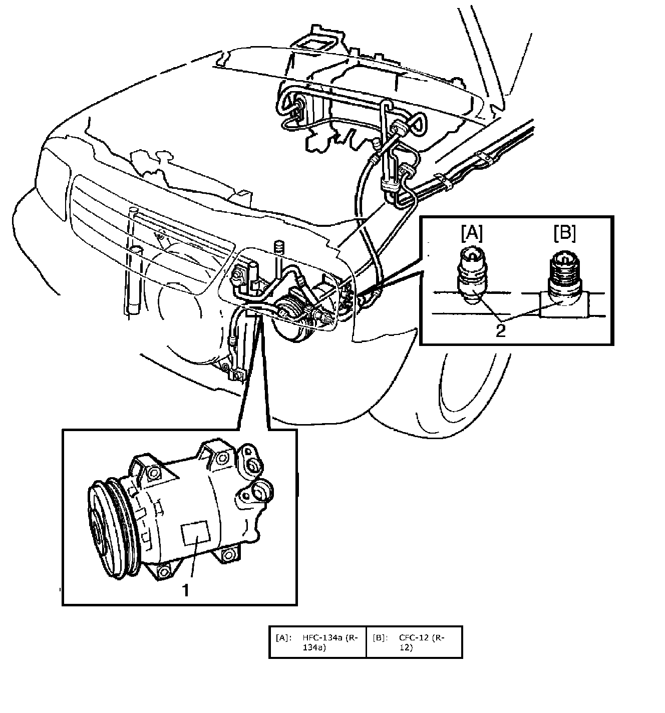 Whether the A/C in the vehicle being serviced uses HFC-134a (R-134a. or CFC-12 (R-12. is indicated on LABEL (1) on the compressor. Also, it can be checked by the shape of the service (charge. valve (2).