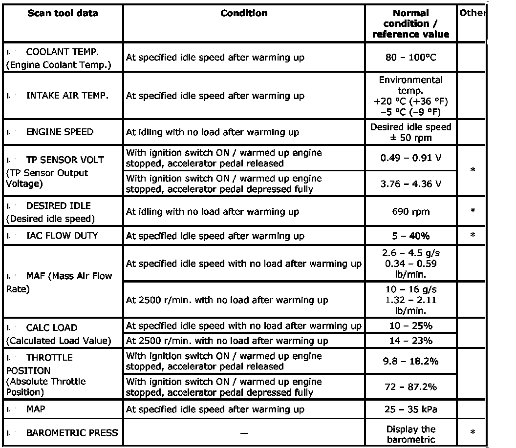 - Item with asterisk (*) in "Other" column can be read only by SUZUKI scan tool.