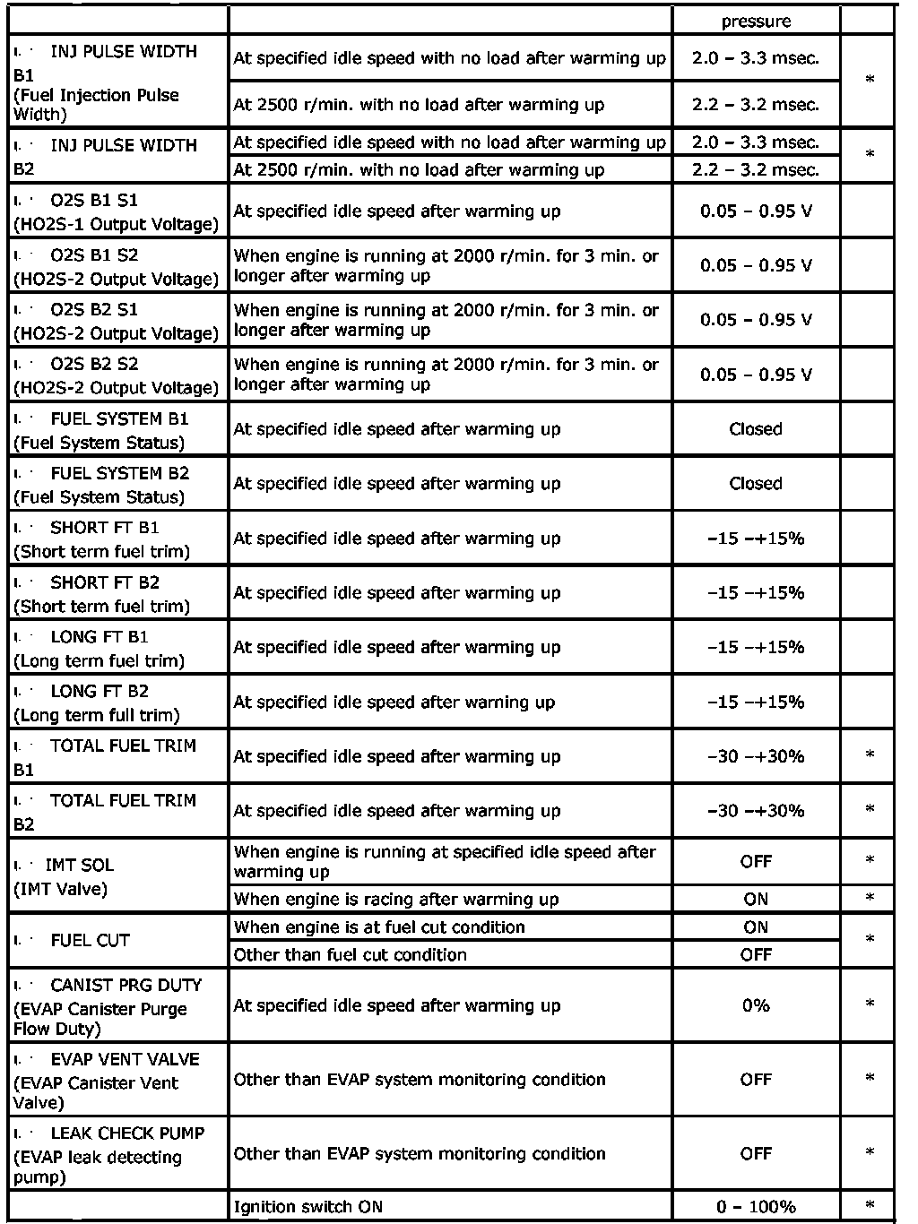 As the data values are standard values estimated on the basis of values obtained from the normally operating vehicles by using a scan tool, use them as reference values. Even when the vehicle is in good condition, there may be cases where the checked value does not fall within each specified data range. Therefore, judgment as abnormal should not be made by checking with these data alone.