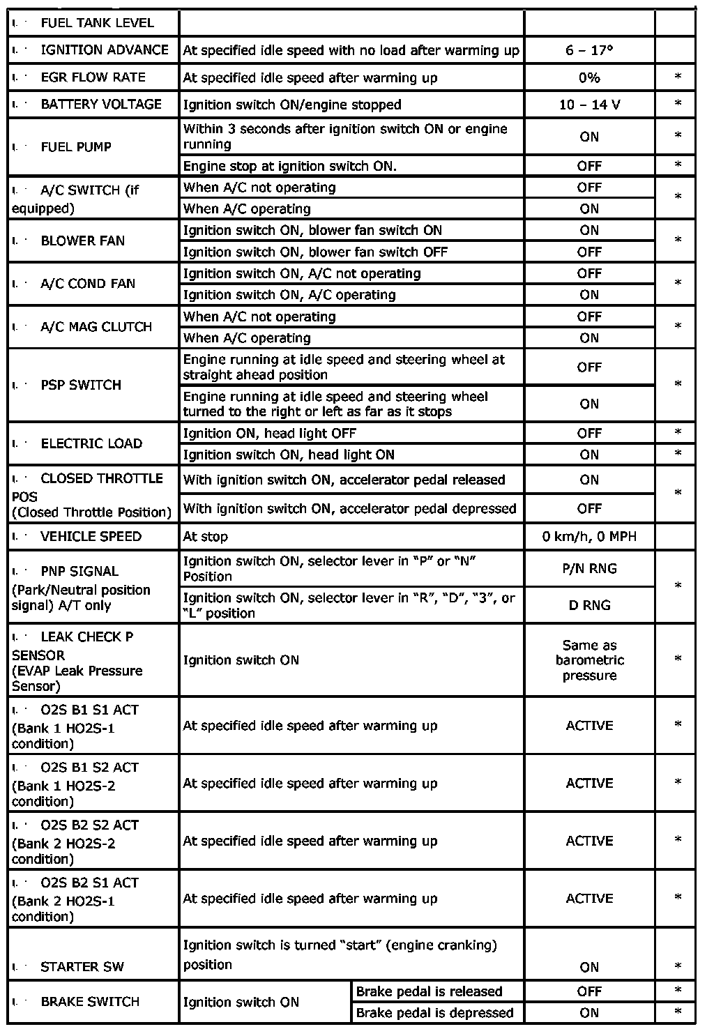 - When checking the data with the engine running at idle or racing, be sure to shift M/T gear to the neutral gear position and A/T gear to the "Park" position and pull the parking brake fully. Also, if nothing or "no load" is indicated, turn OFF A/C, all electric loads, P/S and all the other necessary switches.