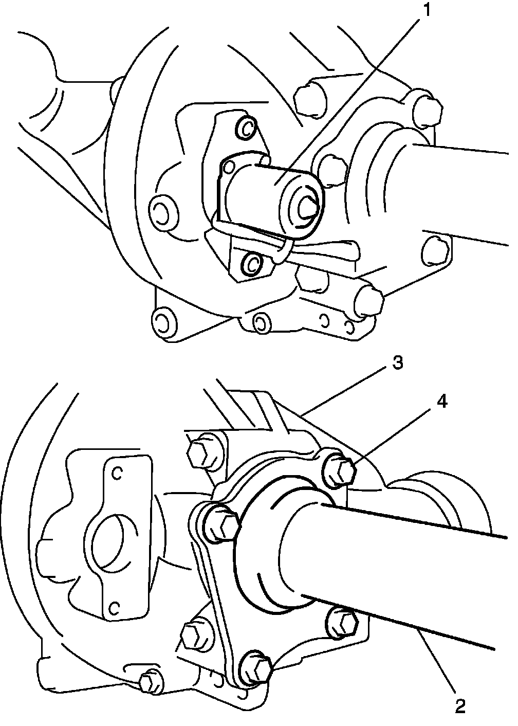 2. Remove axle lock actuator motor (1) and front drive shaft case (2) from differential housing (3) by removing bolts (4).