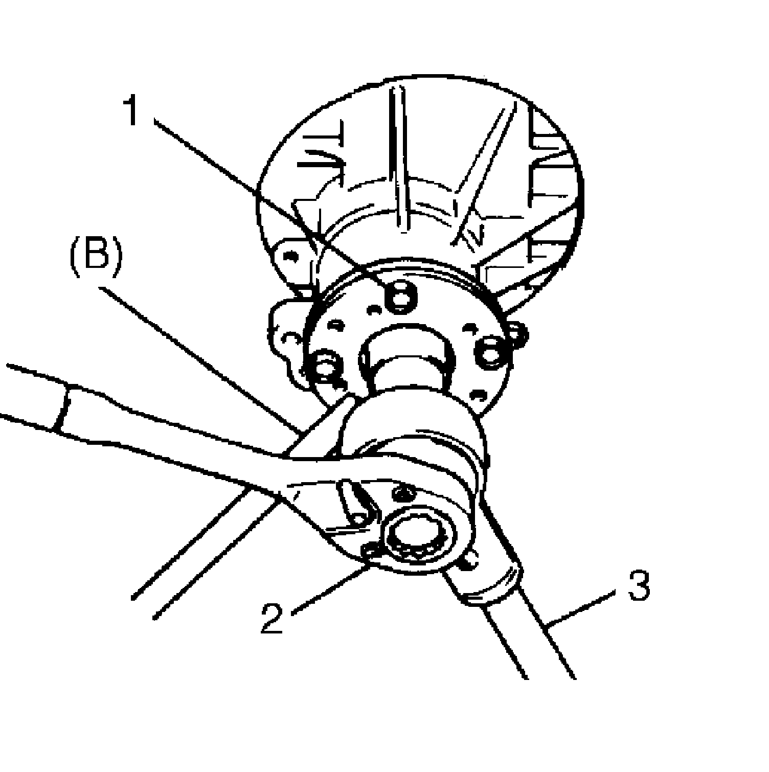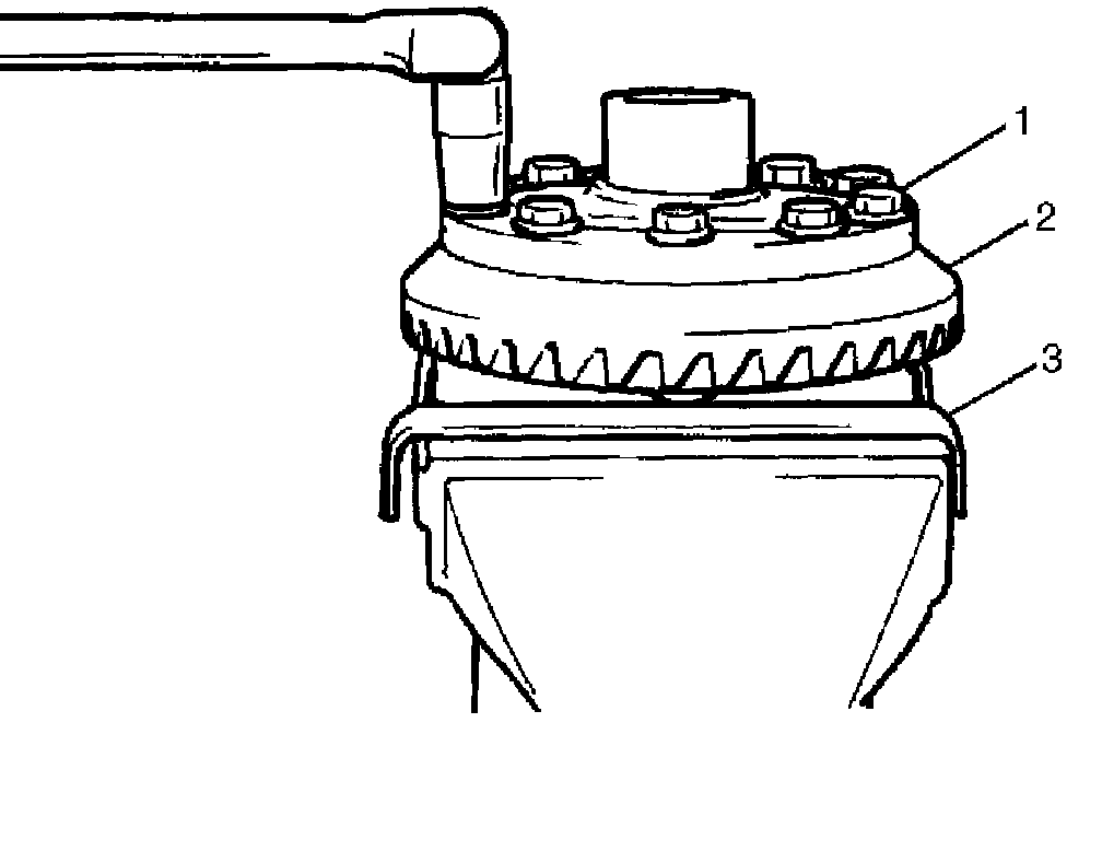 7. Hold universal joint flange with special tool, and then remove flange nut by using socket wrench (2) and power wrench (3).