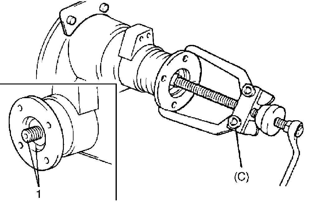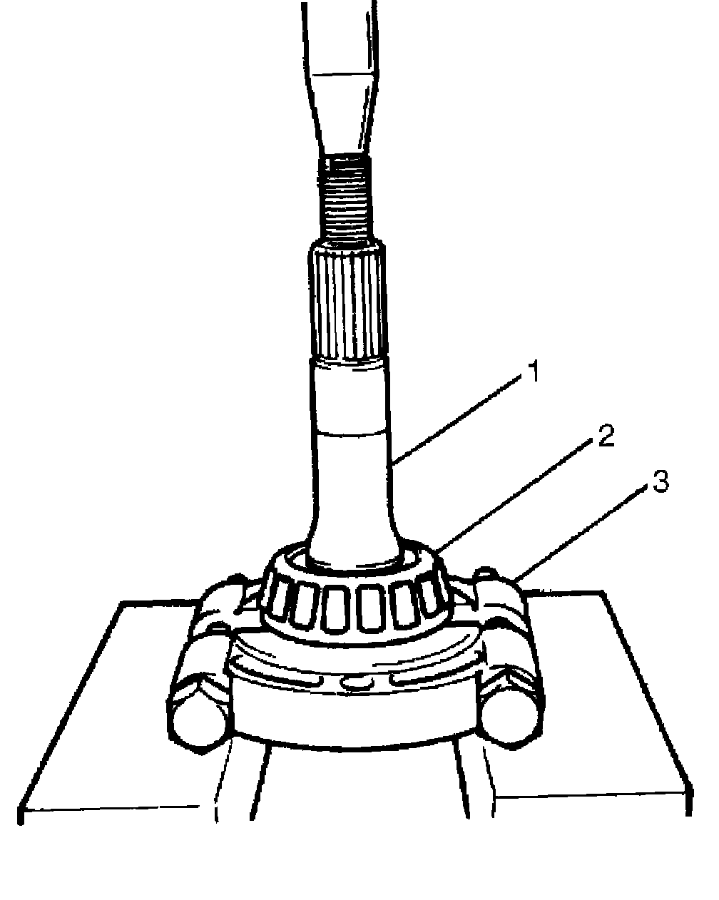 15. Remove front bearing (2) from pinion (1) by using bearing puller (3) and hydraulic press.