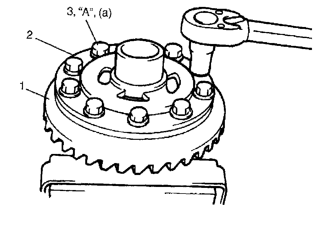 3. Put bevel gear (1) on differential case (2) and fasten them with bevel gear bolts (3) by tightening them to specified torque. Use thread lock cement for bevel gear bolts (3).