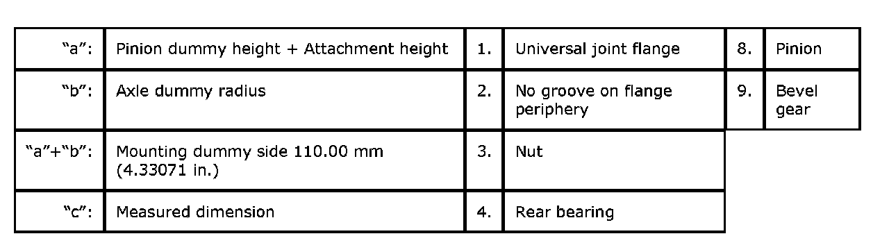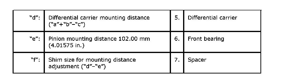 To engage bevel gear and pinion correctly, it is prerequired to install pinion to differential carrier properly by using adjusting shim as described below. Shown in the figure of Step 4) are relative positions of pinion, differential carrier and mounting dummy.