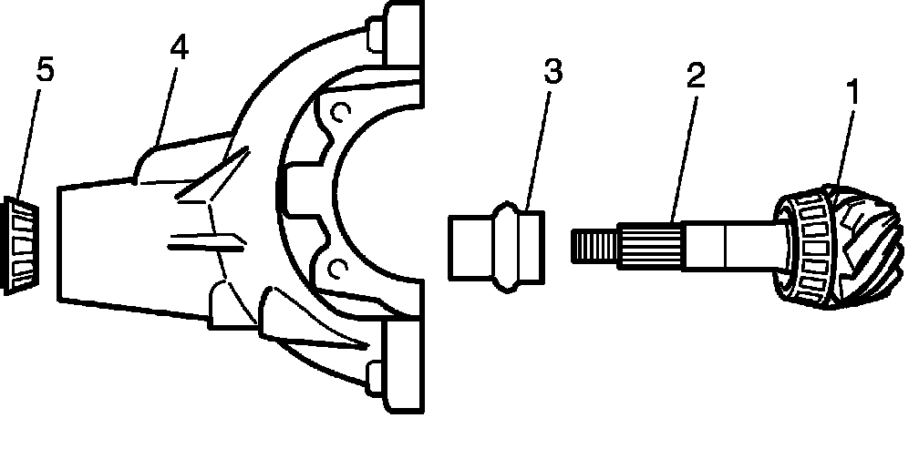 6. With new pinion spacer (3) inserted as shown, install rear bearing (5) to differential carrier (4).