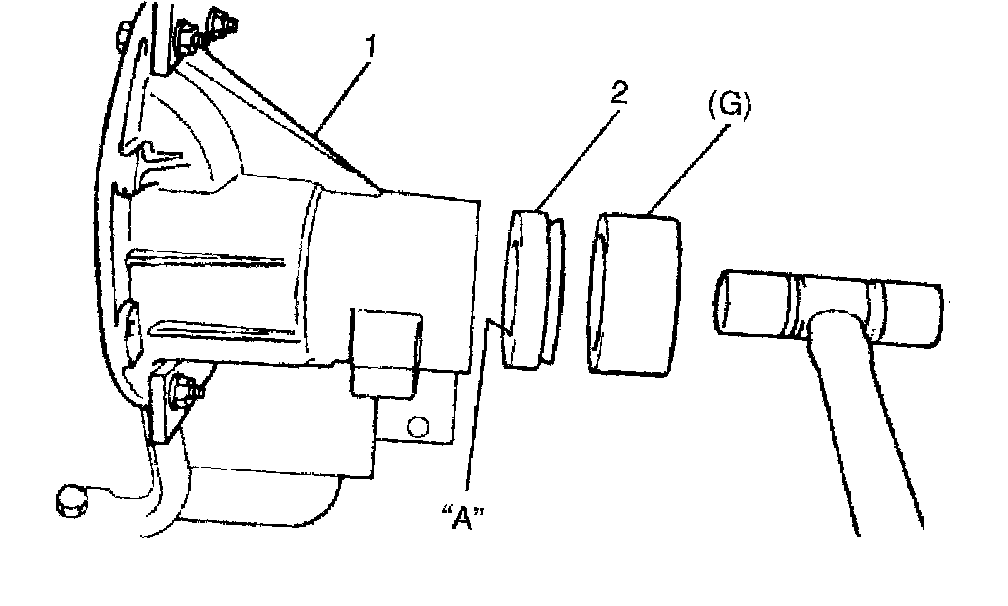 7. Using special tool and plastic hammer, install oil seal (2) into differential carrier (1) till it becomes flush with carrier end. Then, apply grease to oil seal lip.