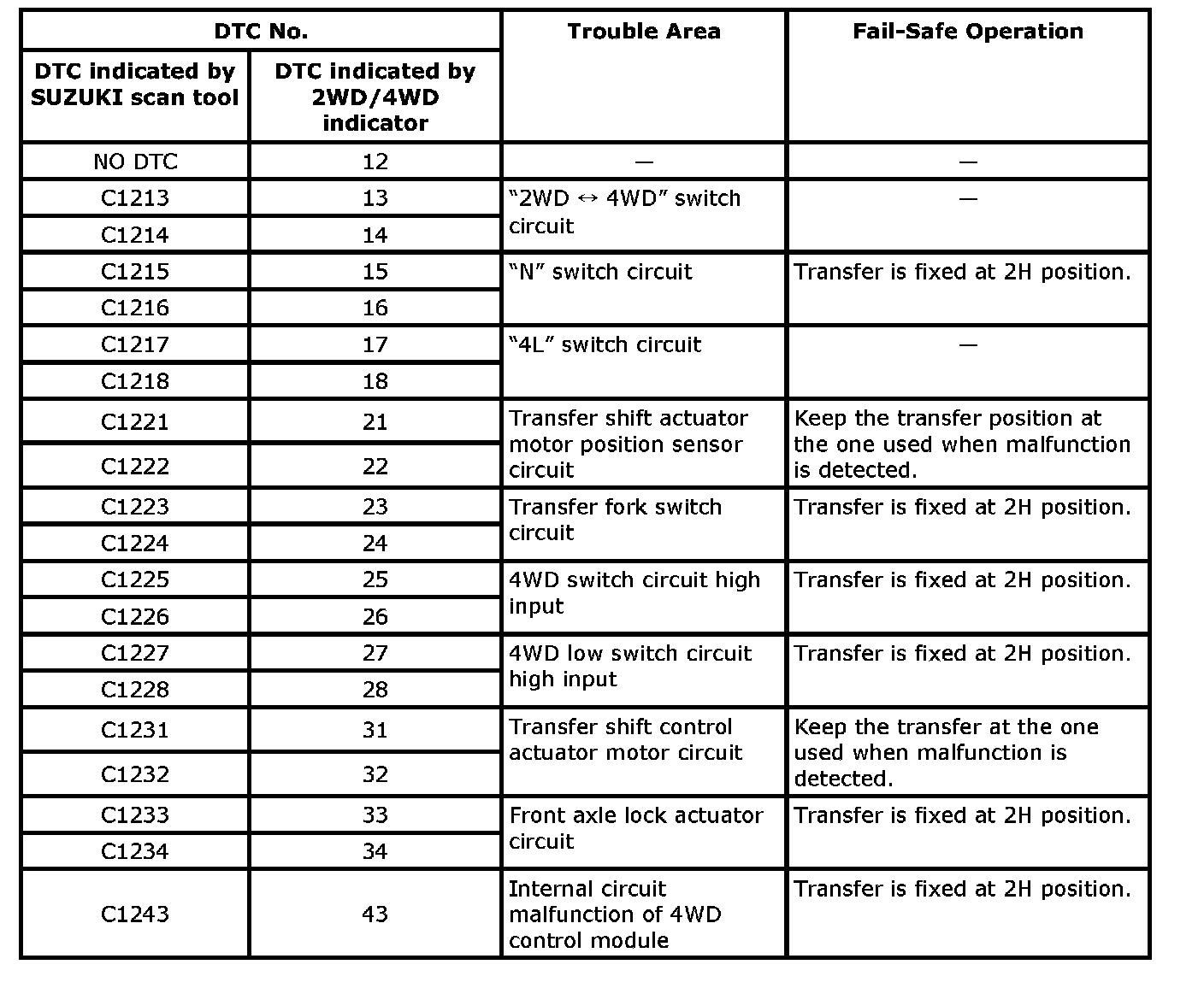 Fail-Safe TableThis function is provided by the safe mechanism that assures safe driveability even when the actuator, switch, sensor or its circuit fails. The following table shows the fail safe function for each fail condition of sensor, actuator, switch, 4WD control module or its circuit.