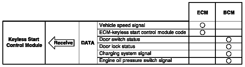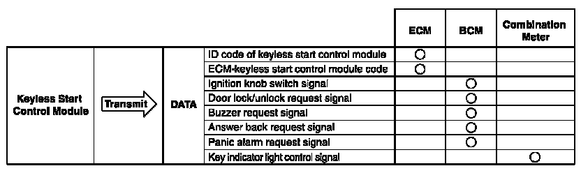 CAN Communication System DescriptionRefer to CAN Communication System Description for CAN communication system description. Keyless start control module communicates control data with each control modules as follows.
