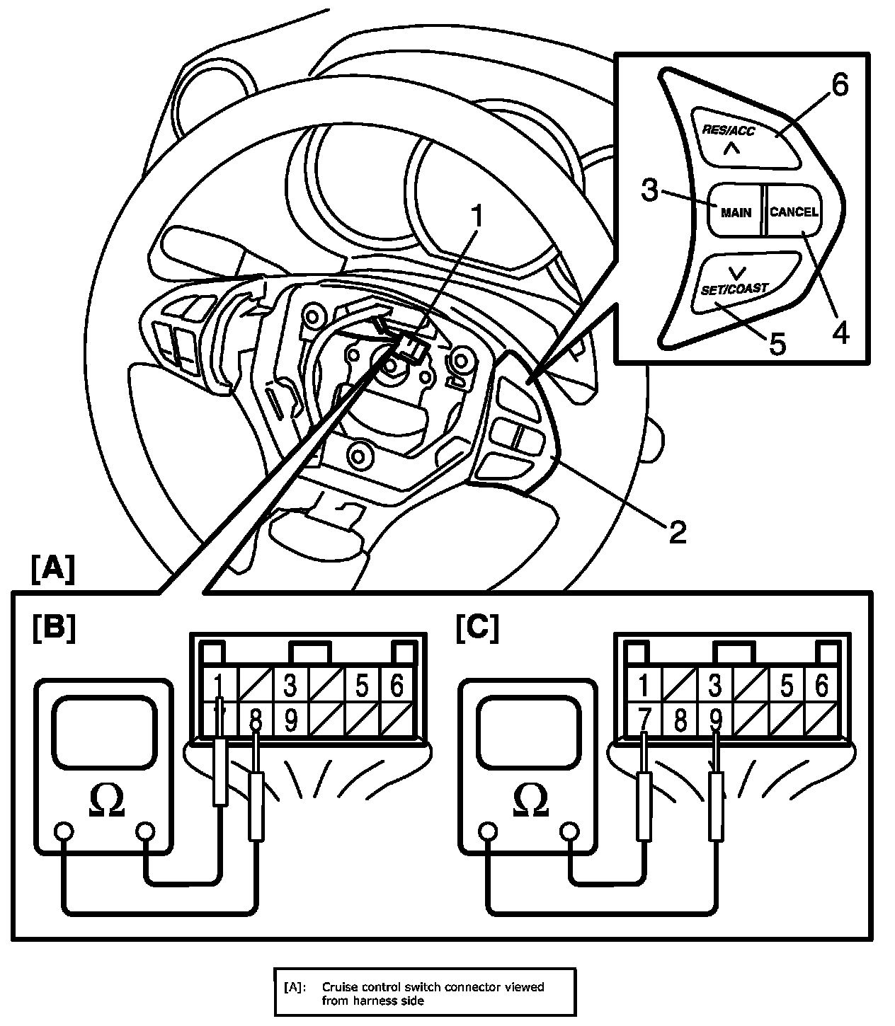 SET/COAST, RES/ACC and CANCEL switches resistance: [C]