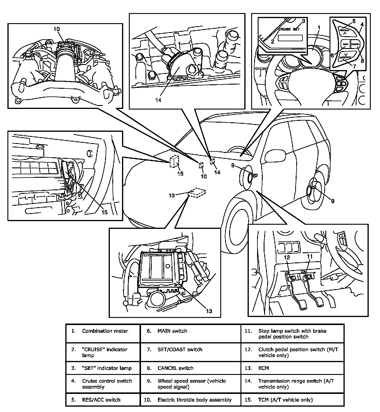 Cruise Control System ConstructionThe cruise control system is a device which maintains a preset vehicle speed while driving at a high speed, e.g., on a highway. It allows the driver to drive his vehicle at a constant speed of 40 km/h (25 mile/h) or higher without depressing the accelerator pedal. The system also has such functions as to change the vehicle speed without operating the accelerator pedal (but using SET/COAST and RES/ACC switches), cancel cruise control (CANCEL switch) and resume the speed in memory automatically after cruise control is cancelled (RES/ACC switch). The system mainly consists of electric throttle body assembly, ECM, cruise control switch (MAIN switch, SET/COAST switch, RES/ACC switch and CANCEL switch), etc.