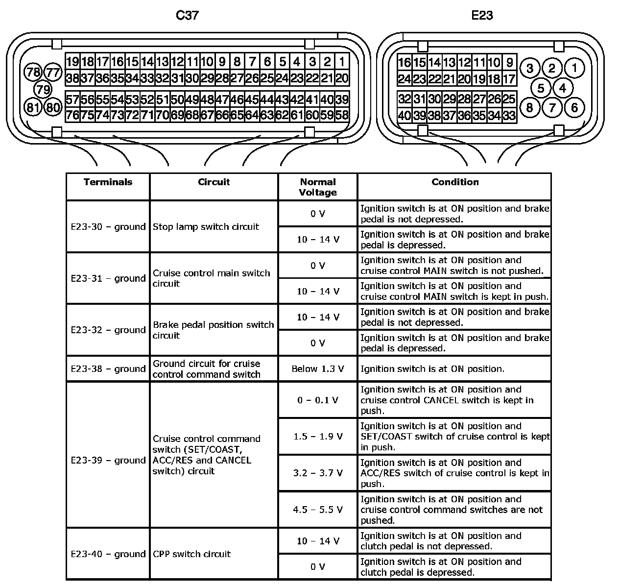 Inspection of Cruise Control System CircuitCruise control system is controlled by ECM. Each switch and circuit can be checked by taking measurement of terminal voltage and terminal to terminal resistance of ECM. When measuring these values, be sure to read precautions for measurement described under Inspection of ECM and Its Circuits.