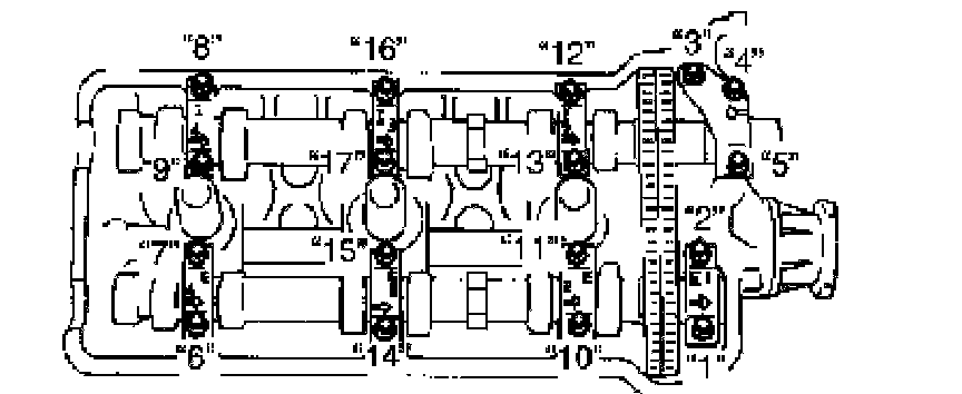 7) Loosen camshaft housing bolts in such order ("1" - "17") as indicated in figure and remove them.