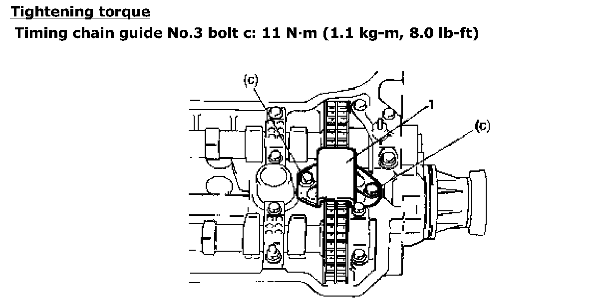 Timing chain tensioner adjuster No.3 bolt c: Tighten 11 Nm (1.1 kgf-m, 7.5 ft. lbs.) by the specified procedure