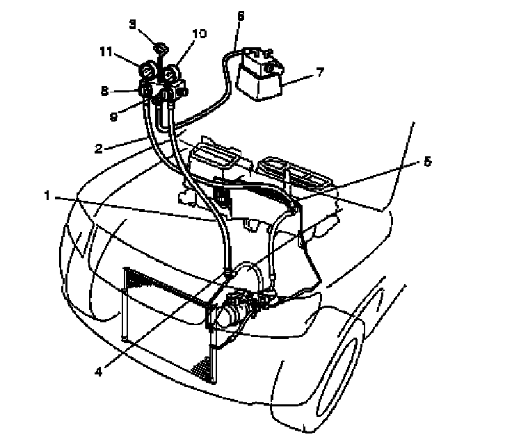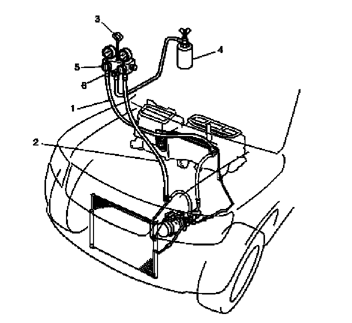 High charging hose (1). High pressure charging valve (4) on discharge hose