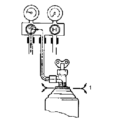 iii. As soon as refrigerant comes out with a "hiss" (1) through a clearance between refrigerant container and tap valve, tighten plate nut as well as manifold gauge set low pressure valve.