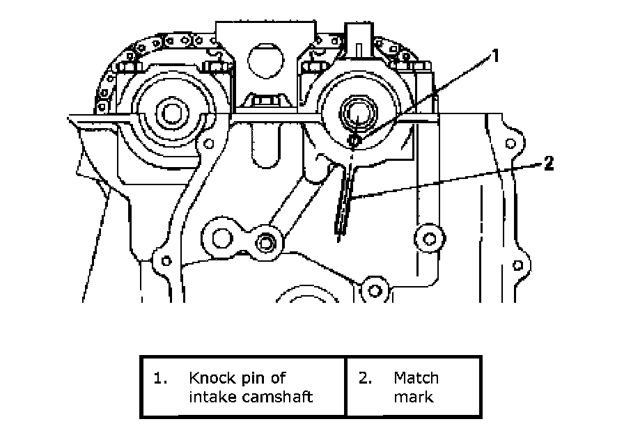 ^ Install idler sprocket No.2 by aligning match marks (2) on LH silver plate (1) of 1st timing chain.
