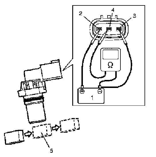 2. Arrange 12 V battery (1) and connect its positive terminal to "Vin" terminal (2) and negative terminal to "Ground" terminal (3) of sensor. Then using ohmmeter, measure resistance between "Vout" terminal (4) of sensor and negative terminal of battery by passing magnetic substance (iron) (5) while keeping approximately 1 mm (0.03 in.) gap with respect to end face of sensor.
