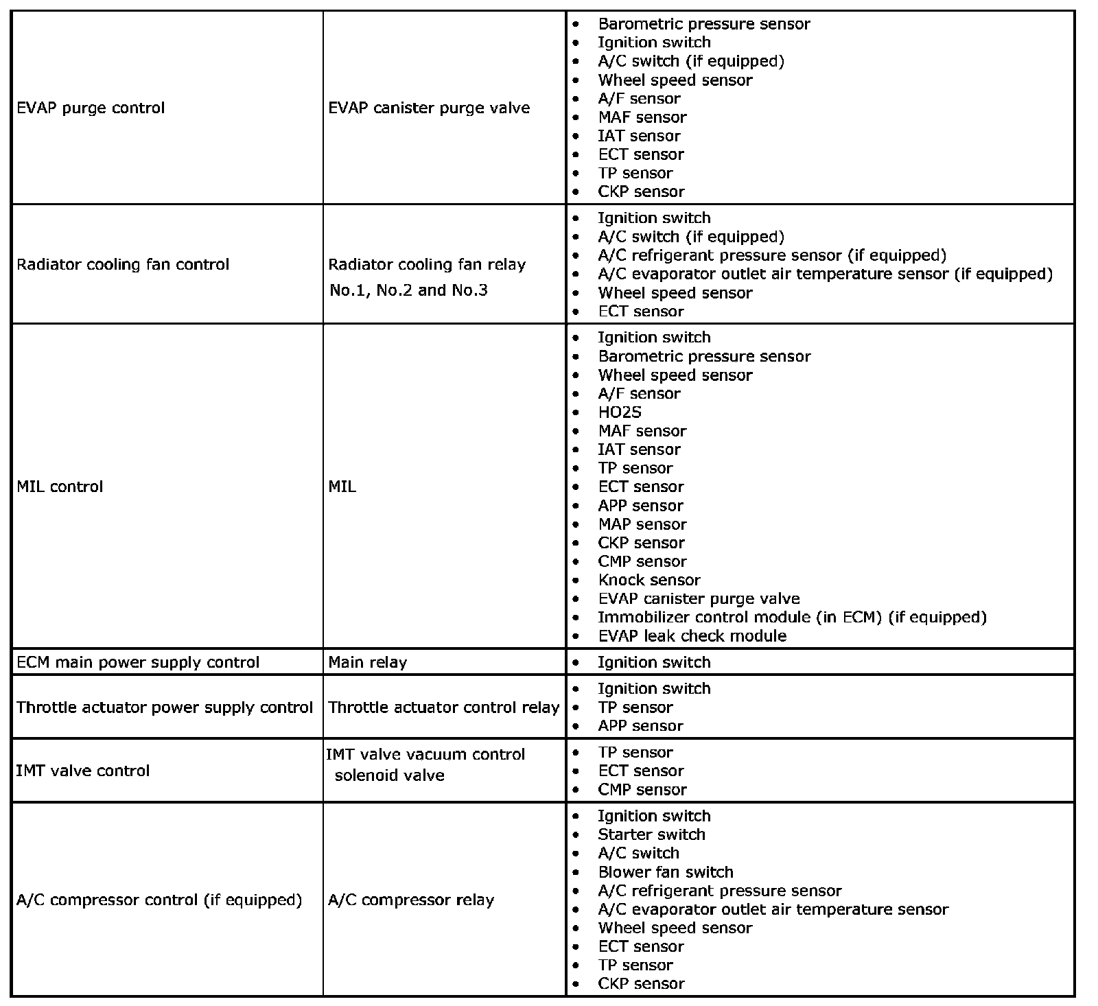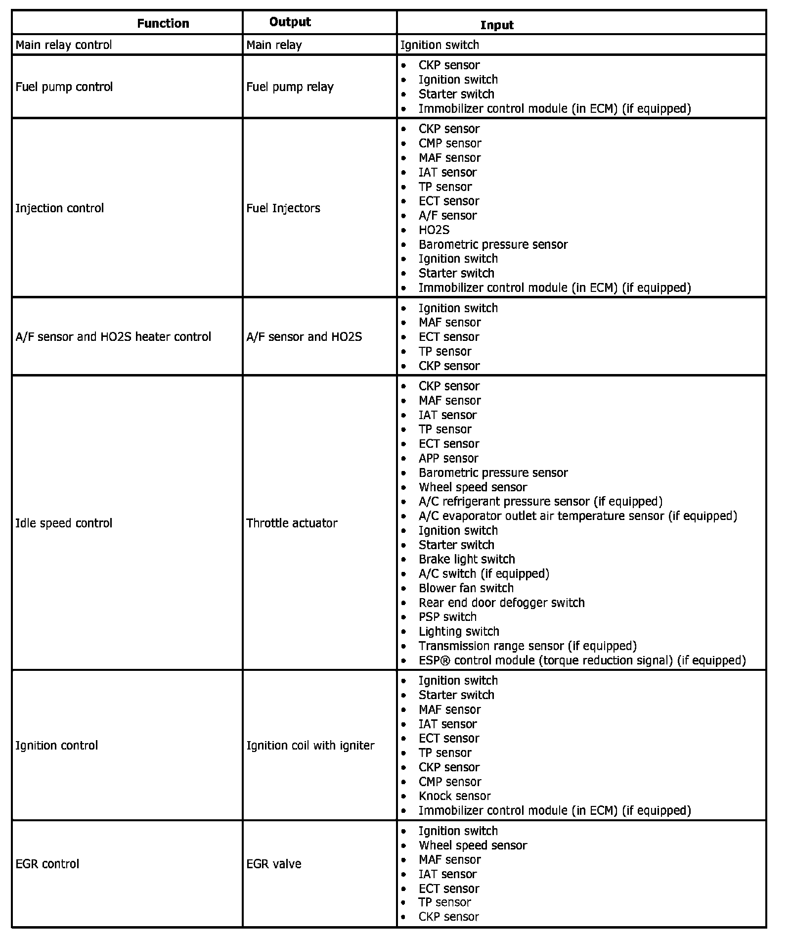 Engine and Emission Control Input / Output Table